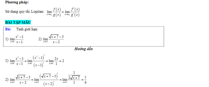Kiểu 1. Sử dụng đạo hàm để tính giới hạn dạng 0/0; vô cùng / vô cùng: Quy tắc LÔPITAN.