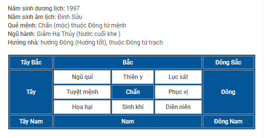 Để biết người sinh năm 1997 hợp hướng nào cần dựa vào yếu tố cung mệnh. Theo đó, người sinh năm 1997 Đinh Sửu có quái số 8 cả nam và nữ đều thuộc cung Chấn, hành Mộc, thuộc Đông Tứ Mệnh. Như vậy người sinh năm 1997 hợp các hướng thuộc Đông Tứ Trạch gồm: Đông, Đông Nam, Bắc, Nam.