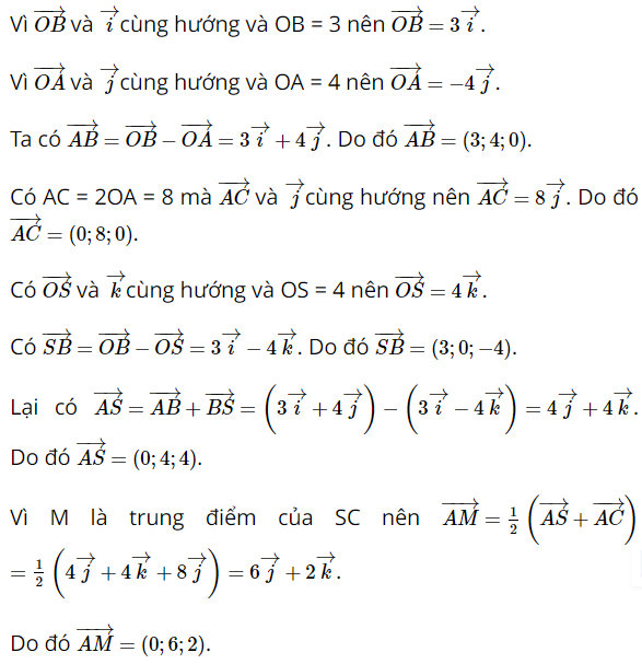 c) A nằm trên tia đối của tia Oy và OA = 3 nên $large overrightarrow{OA}=-3overrightarrow{j}$ . Suy ra A(0; −3; 0).