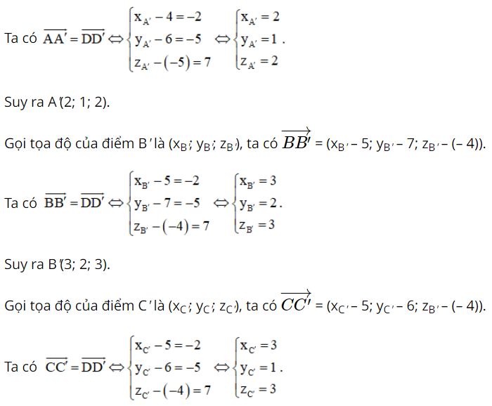Vậy D(4; 5; – 5), A'(2; 1; 2), B'(3; 2; 3), C'(3; 1; 3).