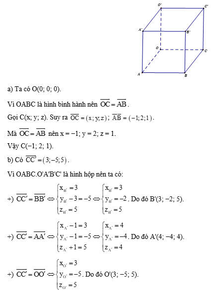 Theo quy tắc hình hộp, ta có: $large overrightarrow{OC’}=overrightarrow{OD}+overrightarrow{OB}+overrightarrow{OA’}=2overrightarrow{i}+4overrightarrow{j}+3overrightarrow{k}$