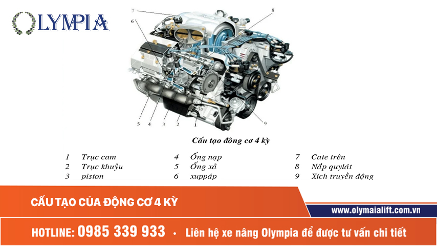 Động cơ 4 kỳ bao gồm nhiều thành phần quan trọng, và chúng hoạt động cùng nhau để tạo ra sức mạnh cơ học. Dưới đây là một số thành phần quan trọng của động cơ 4 kỳ: