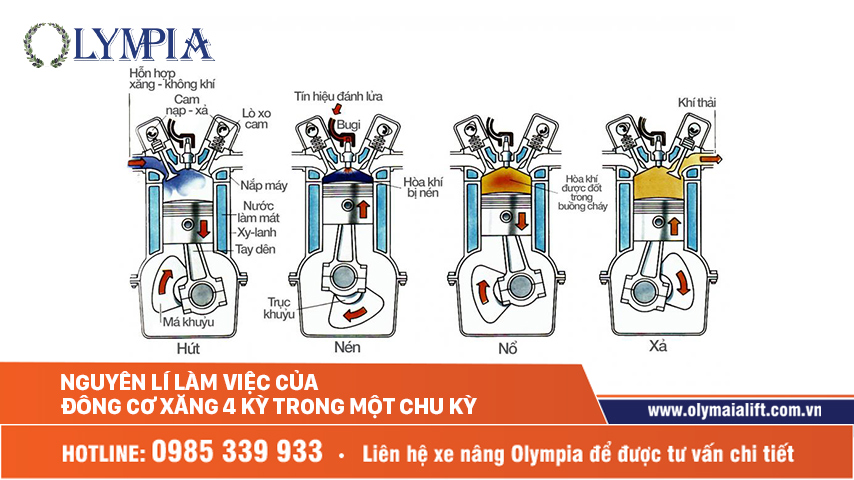 Nguyên lí làm việc của động cơ xăng 4 kì trong một chu kỳ