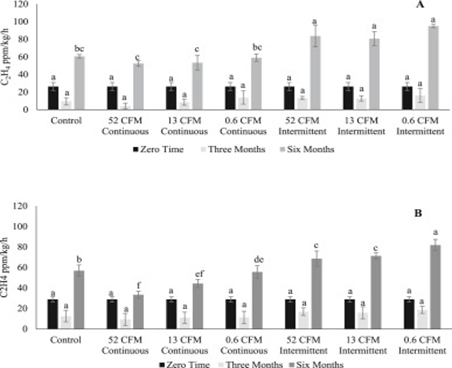 Fig. 2. A & B. “Effect of ventilation condition on ethylene production (ppm/kg/h) by Rio Grande Russet after six months of cold storage at 5 °C ± 2 and RH 95% ± 5 in 2016 (A) and 2017 (B) season,” Emragia, et al. 2021. (Image credits. https://doi.org/10.1016/j.jafr.2020.100095).