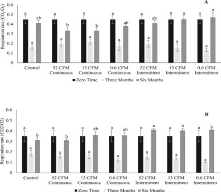 Fig. 3. A & B. “Effect of ventilation condition on the respiration rate of Rio Grande Russet after six months of cold storage at 5 °C ± 2 and 95% RH ± 5 in the 2016 (A) and 2017 (B) season,” Emragia, et al. 2021. (Image credits. https://doi.org/10.1016/j.jafr.2020.100095).
