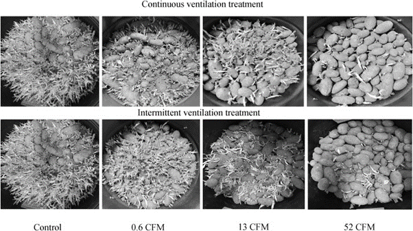 Fig. 4. “Effect of different ventilation treatments on the sprouting of Rio Grande Russet. The top row represents continuous ventilation, while the bottom row represents intermittent ventilation,” Emragia, et al. 2021. (Image credits. https://doi.org/10.1016/j.jafr.2020.100095).