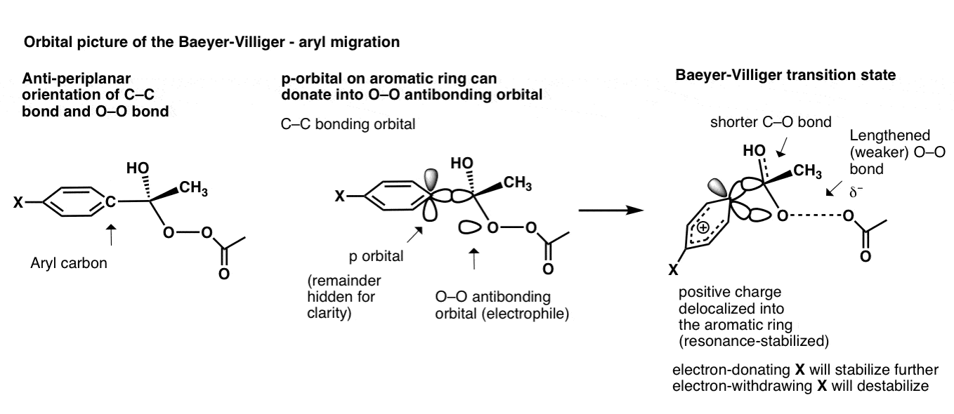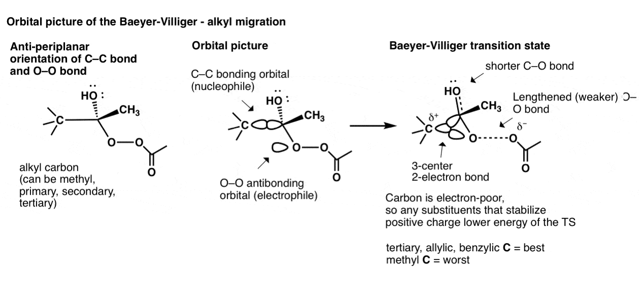 To go even deeper we can look at the orbital picture of an alkyl migration in the Baeyer-Villiger. This begins with the C-C bond aligned in an anti-periplanar arrangement with the O-O bond. The C-C bonding orbital then begins overlap with the O-O antibonding orbital, leading to a transition state where there are three atoms sharing two electrons! (This is called, not surprisingly, a “3-center, 2-electron bond”.