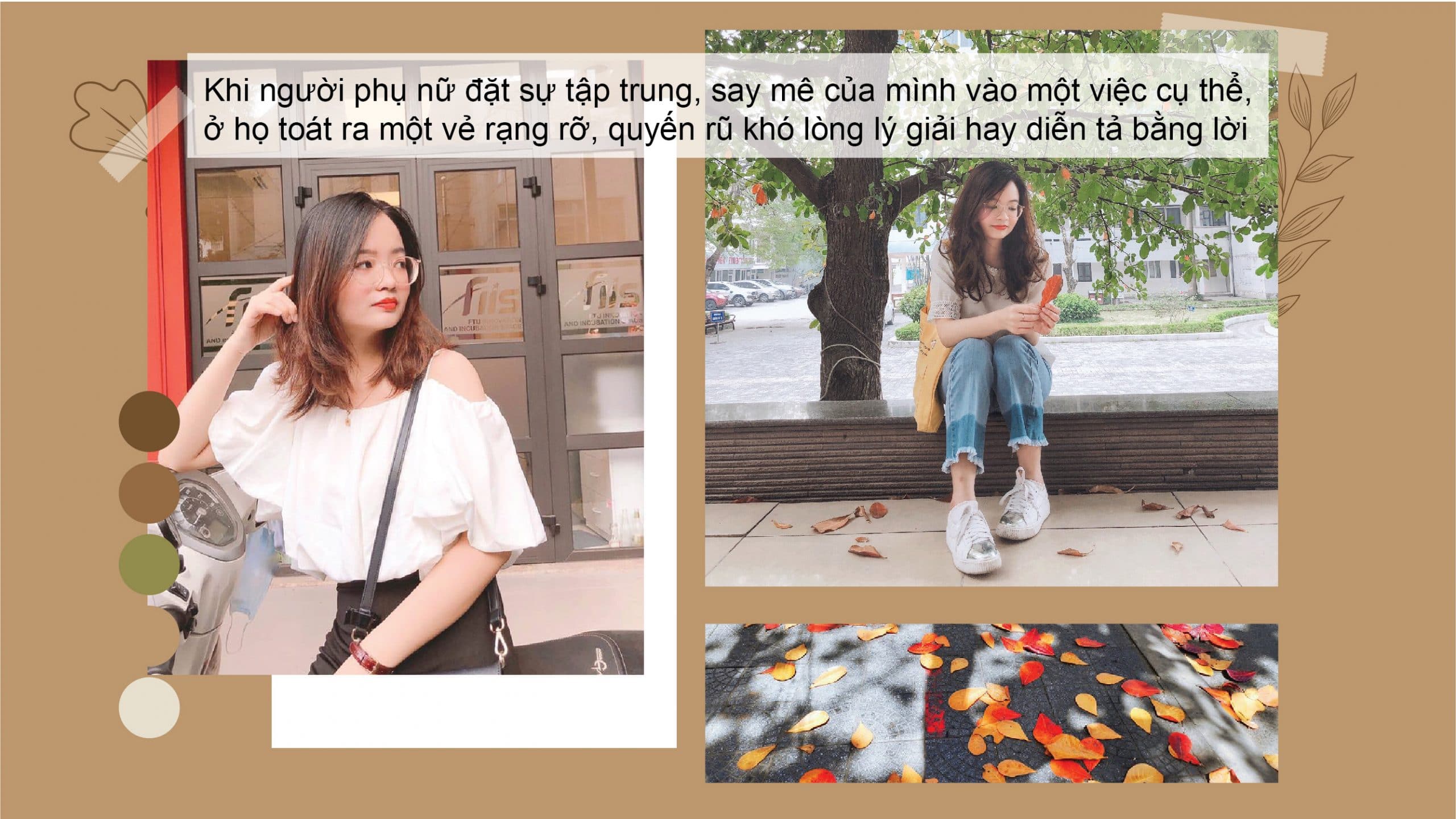 Mỗi người sẽ thể hiện vẻ đẹp của họ trong những khoảnh khắc khác nhau. Nhưng đối với mình, một người phụ nữ trông sẽ đẹp nhất khi họ đang tập trung làm một điều gì đó, có thể là công việc, nấu nướng, ca hát, vẽ tranh, … Khi người phụ nữ đặt sự tập trung, say mê của mình vào một việc cụ thể, ở họ toát ra một vẻ rạng rỡ, quyến rũ khó lòng lý giải hay diễn tả bằng lời. Và đó là vẻ đẹp mình đoán rằng không chỉ mình mà cả phái mạnh cũng bị thu hút và hết lòng ngưỡng mộ.