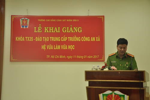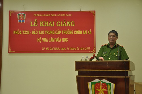 Phát biểu tại lễ khai giảng, đồng chí Đ/c Thiếu tướng, PGS,TS. Vũ Đức Khiển – Bí thư Đảng ủy – Hiệu trưởng nhà trường chỉ đạo các đơn vị chức năng của Trường cao đẳng CSND II phối hợp với công an Tp. Hồ Chí Minh, công an huyện Hóc Môn đảm bảo hiệu quả, chất lượng đào tạo của lớp học. Đồng thời nhắc nhở các đồng chí học viên phải học tập và rèn luyện với ý thức tự giác, tích cực, chủ động luôn luôn khắc phục mọi khó khăn trong công tác, hoàn cảnh của bản thân và gia đình, kiên quyết đấu tranh chống mọi biểu hiện tiêu cực trong học tập, chấp hành tốt mọi nội quy, quy chế học tập của Bộ Giáo dục & Đào tạo, của Trường Cao đẳng CSND II và Công an thành phố Hồ Chí Minh. Tham gia học tập đầy đủ, tích cực nghiên cứu, đào sâu suy nghĩ để nắm thật vững những nội dung, kiến thức được thầy cô giáo truyền đạt nhất là các nguyên tắc, nội dung, phương pháp và các quy trình công tác nghiệp vụ chuyên môn, vận dụng linh hoạt vào thực tế công tác ở từng đơn vị địa phương với phương châm: Học đi đôi với hành, lý luận gắn liền với thực tiễn; học kỹ, nhớ lâu, hiểu sâu vận dụng tốt.