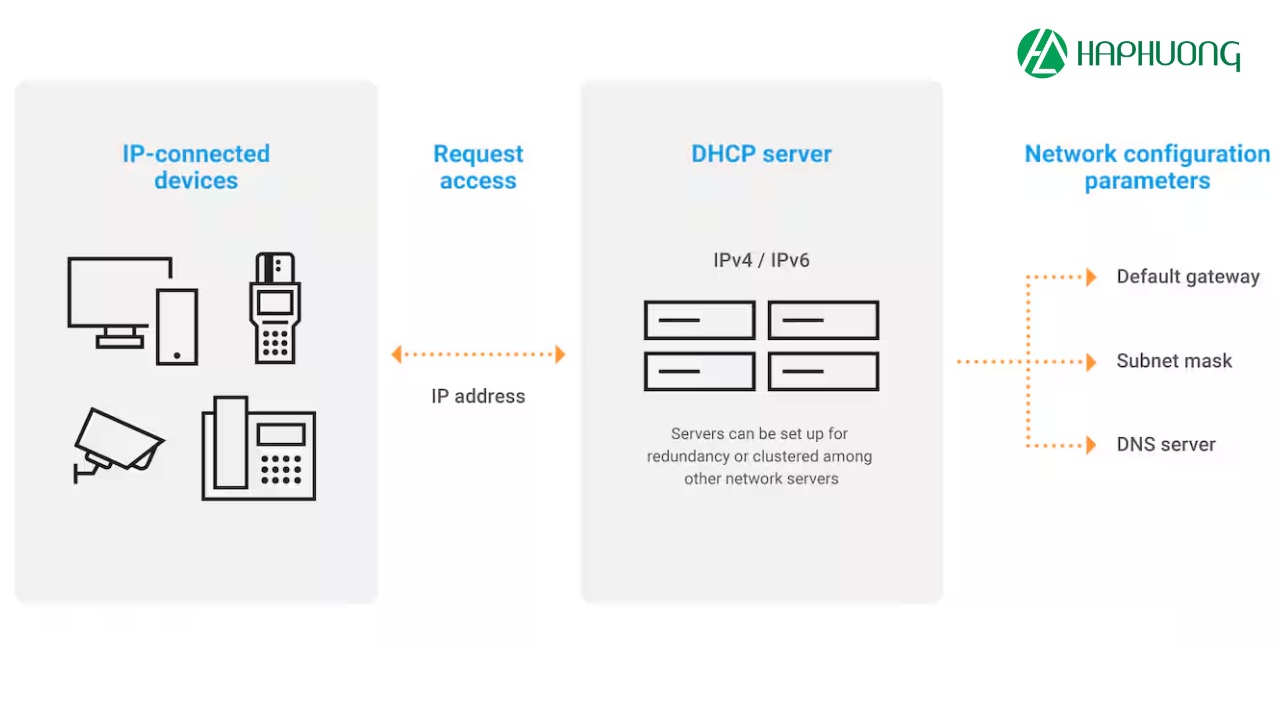 DHCP (Dynamic Host Configuration Protocol) là giao thức dùng để tự động cấp phát địa chỉ IP cho các thiết bị kết nối vào mạng. Thay vì phải cấu hình IP tĩnh cho từng thiết bị, DHCP sẽ cấp phát IP động cho các thiết bị khi chúng kết nối vào mạng giúp quản lý dễ dàng và linh hoạt hơn.