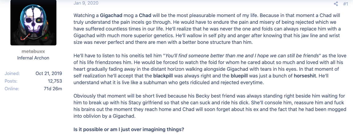 But the obsession with ranking looks and status leads to more and more microscopic demarcations. A seasoned poster will create multiple subclasses of Chad within the category, from the lower-tier “Chadlite” up to the GigaChad, an apex predator who theoretically functions as a check on the sexual opportunities of regular Chads. “Watching a Gigachad mog [i.e., outperform] a Chad will be the most pleasurable moment of my life,” wrote an incels.co user last year, as “in that moment a Chad will truly understand the pain incels go through.”