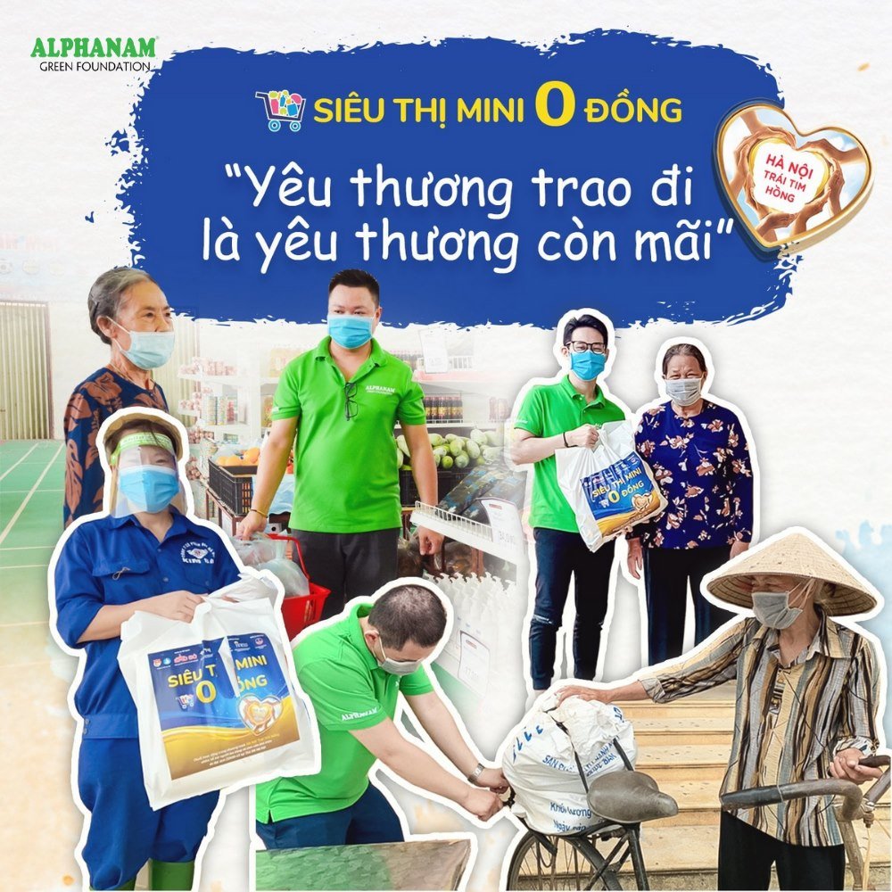Đặc biệt, tháng 8/2021, đúng vào dịp tâm dịch Covid 19, Alphanam Green Foundation đã vận hành thành công mô hình Siêu thị mini 0 đồng tại huyện Thanh Oai và huyện Phú Xuyên – Hà Nội. Dành tặng bà con 2000 phiếu mua hàng với tổng giá trị hơn 800 triệu đồng, tặng 5 tấn gạo cho hai xã Bình Minh và Cao Viên; tặng 1 tấn gạo hỗ trợ cho các hoàn cảnh khó khăn, bị ảnh hưởng bởi đại dịch tại xã Khai Thái, huyện Phú Xuyên.