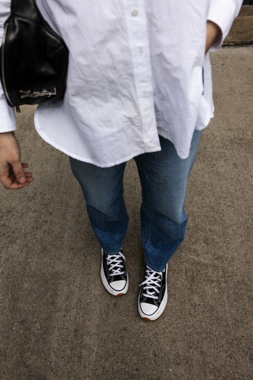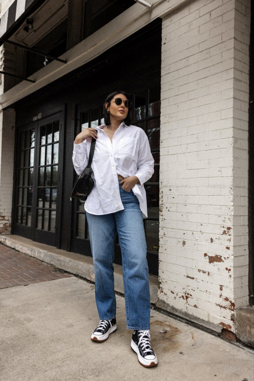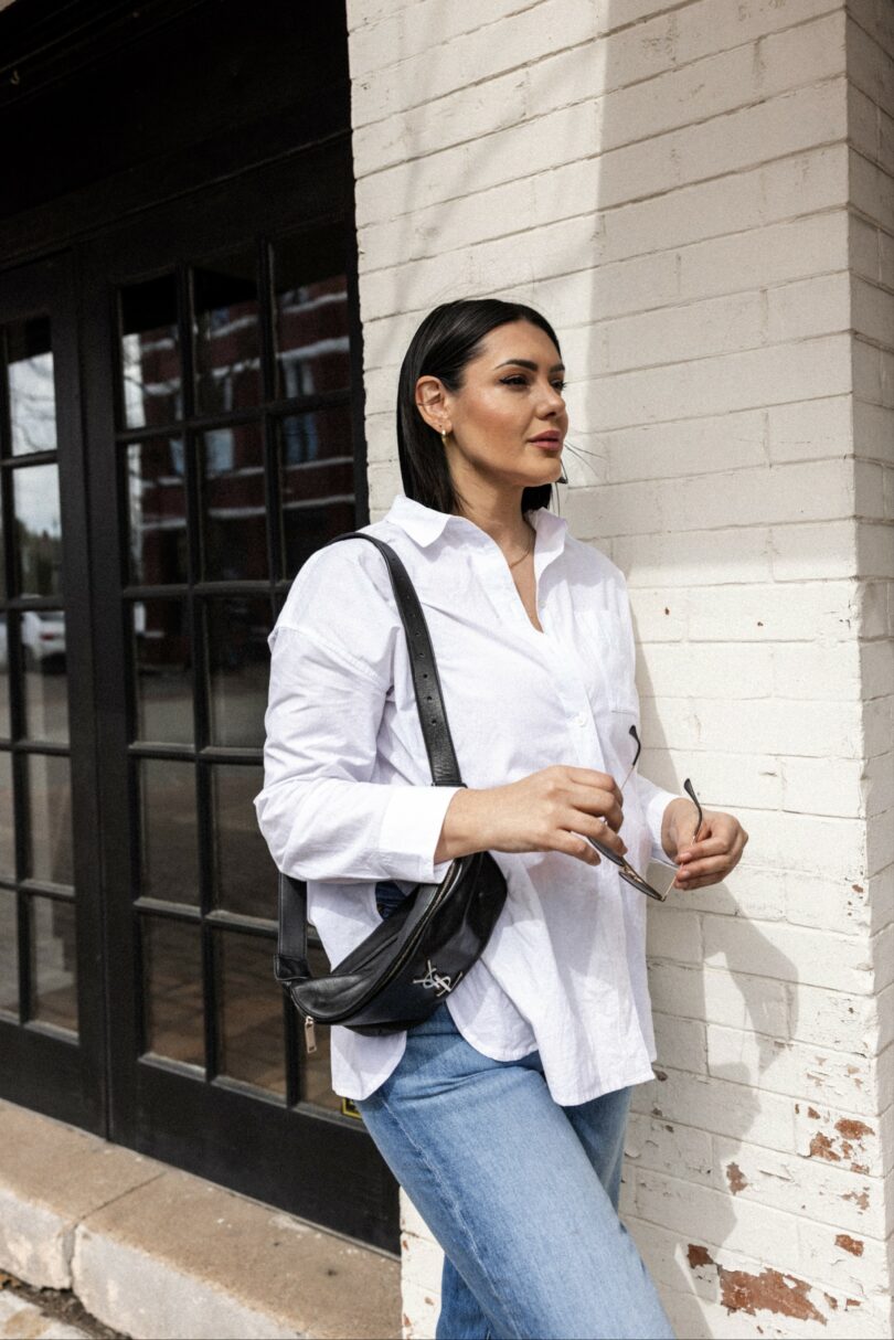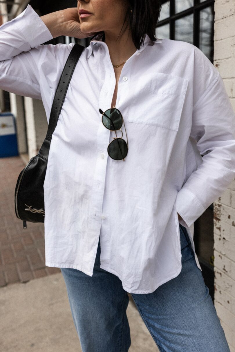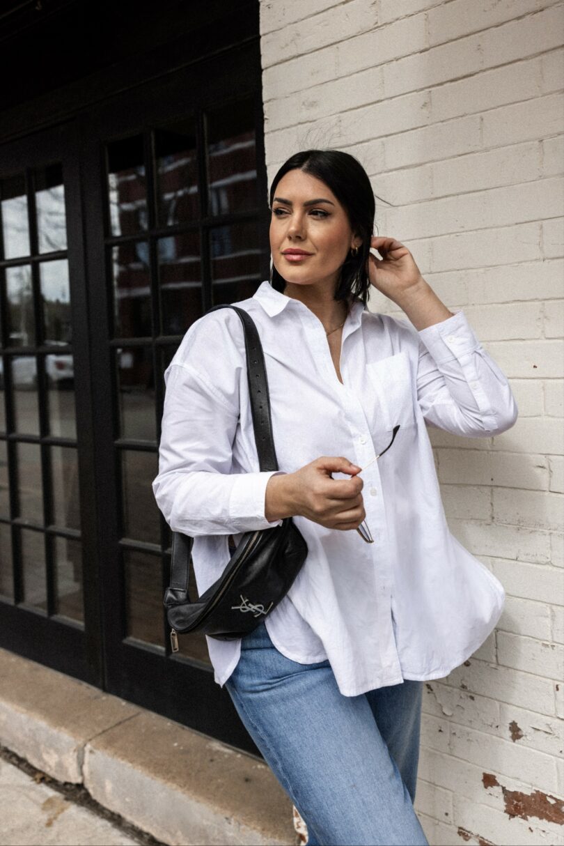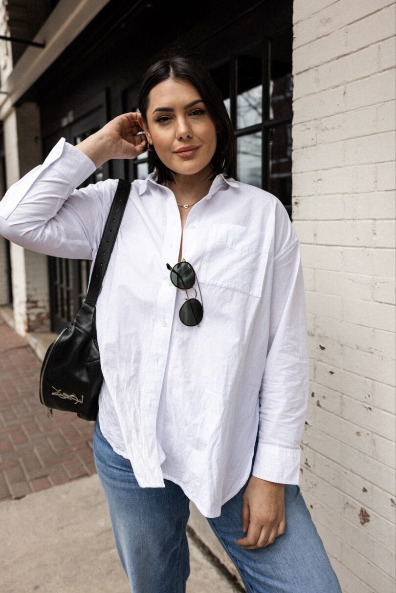 So today I’ll share with you the white one, a classic in an oversized fit. I live for oversized fit button down blouses and I’ll tell you why: as a lady with big boobs button down shirts are a struggle for me. I either look like I’m in the service industry or with one wrong move, my boobs will bust all the buttons open on the shirt. (No shade to the service industry though, as I know this look from many personal experiences. It’s just like — we all want to leave our work uniform at work, you know? I don’t want to go to dinner and all of a sudden someone gives me a tray and I’m taking orders. Have I said too much? I’ve said too much.)