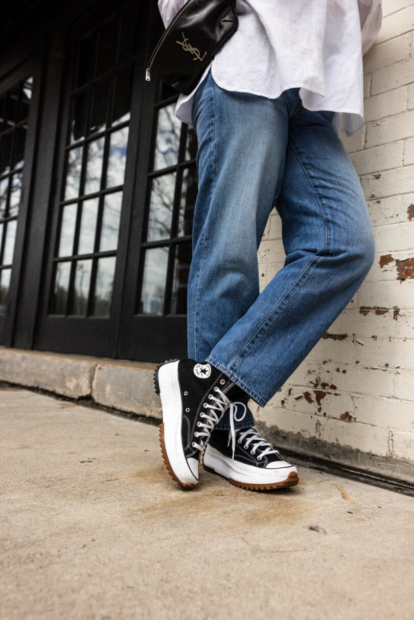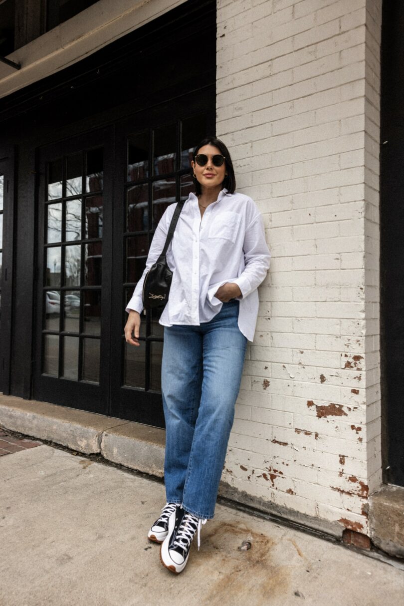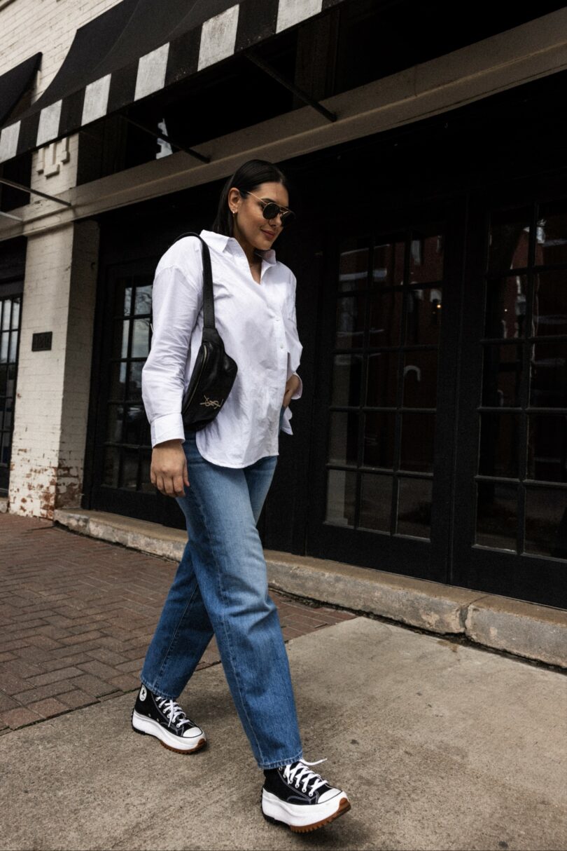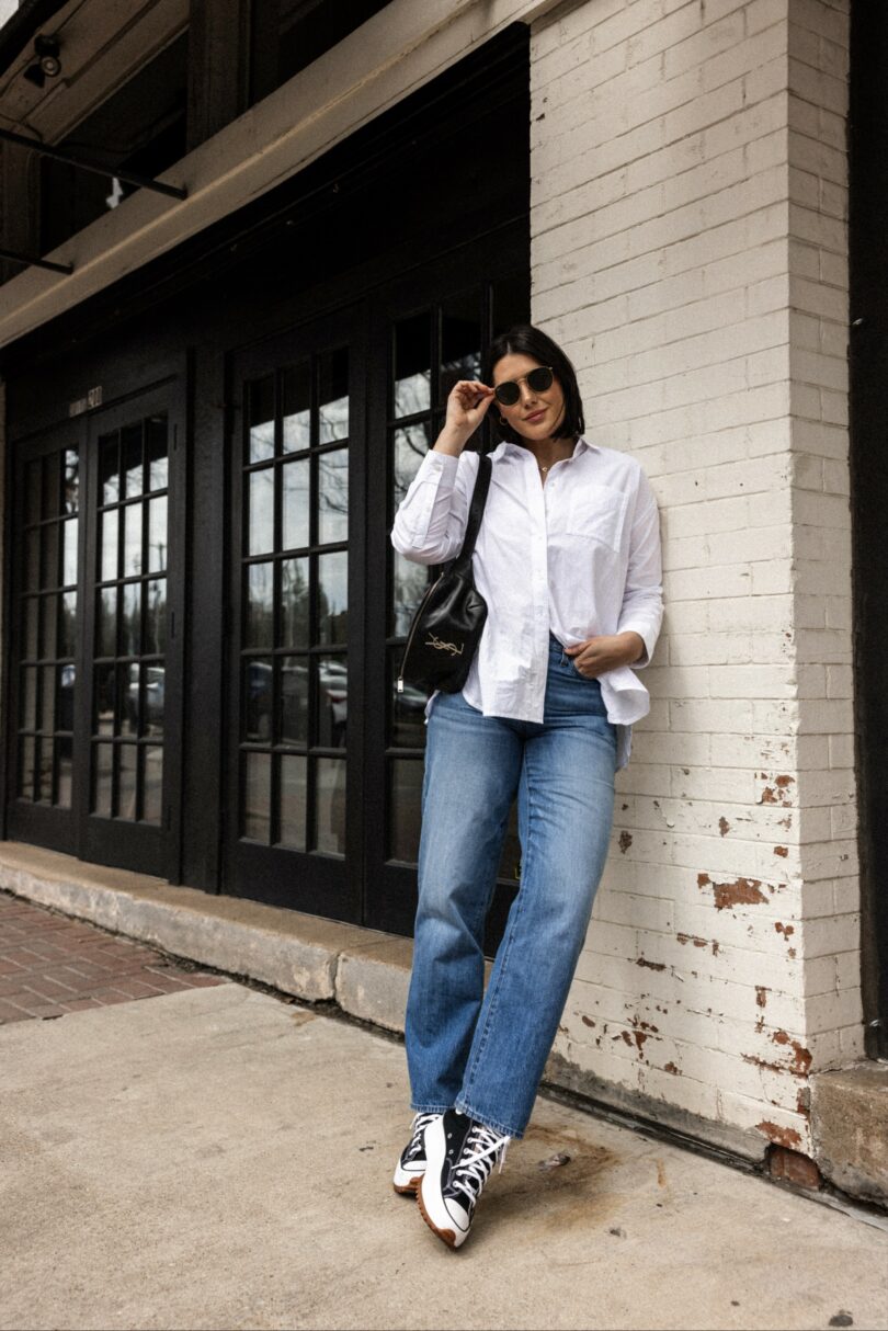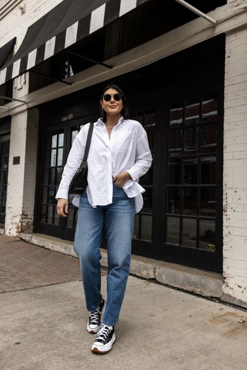 But the oversized button down is perfect for us blessed gals. Because it’s so oversized, the buttons button all the way down no gaps and it actually looks chic. Now here I went very casual with my look, but I promise you with the right outfit the oversized blouse is chic perfection. I am in the medium of this Madewell blouse (As well as the other two, lol) and it fits very generously oversized. If you are smaller up top, size down one. But overall it’s a nice loose fit and I love it.