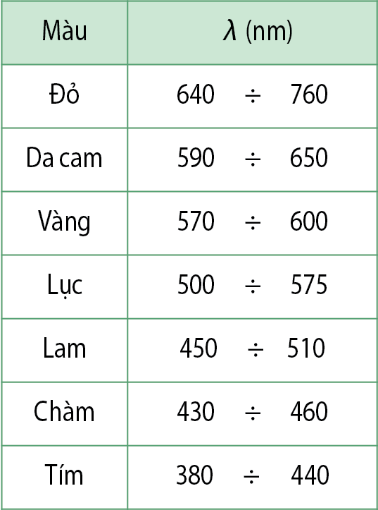 2. Các ánh sáng đơn sắc có bước sóng trong khoảng từ 380 nm (ứng với màu tím trên quang phổ) đến chừng 760 nm (ứng với màu đỏ) mới gây ra cảm giác sáng là các ánh sáng nhìn thấy được (khả kiến).