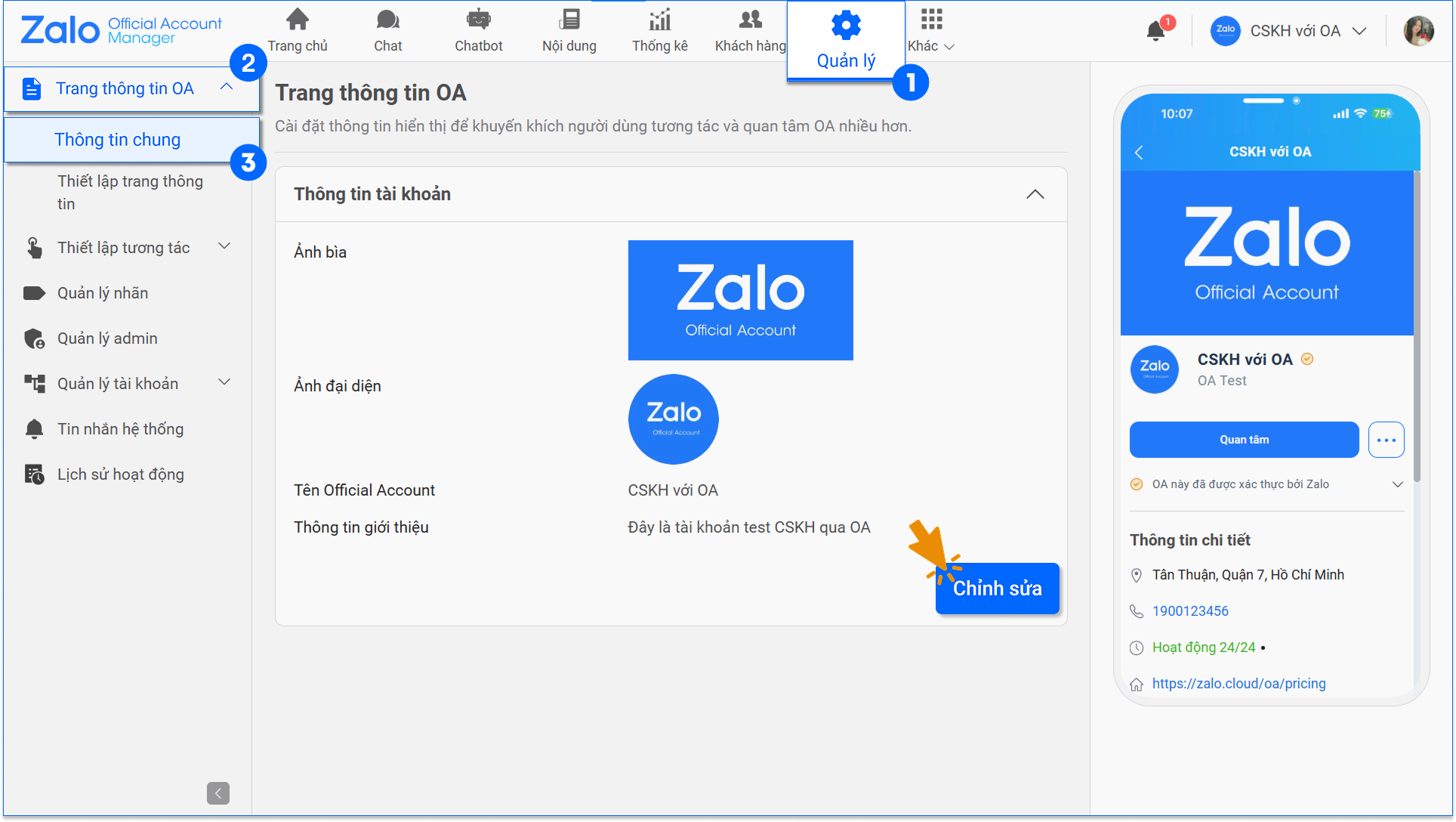 Bước 2: Chọn mục “Quản lý” ➞ Chọn “Trang thông tin OA” ➞ Chọn tiếp Thông tin chung