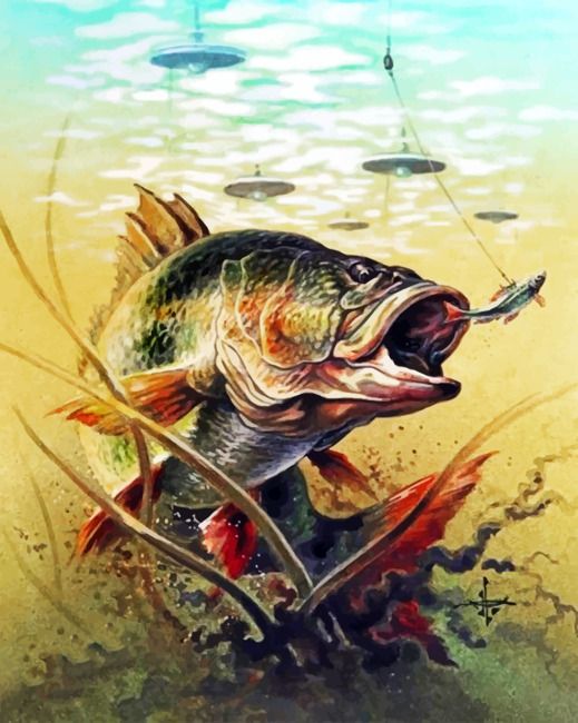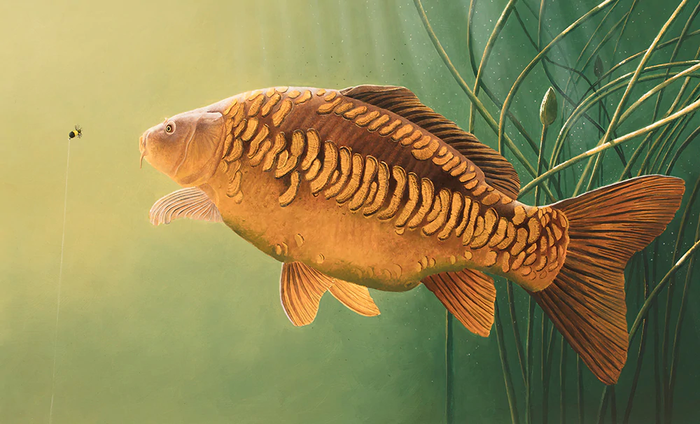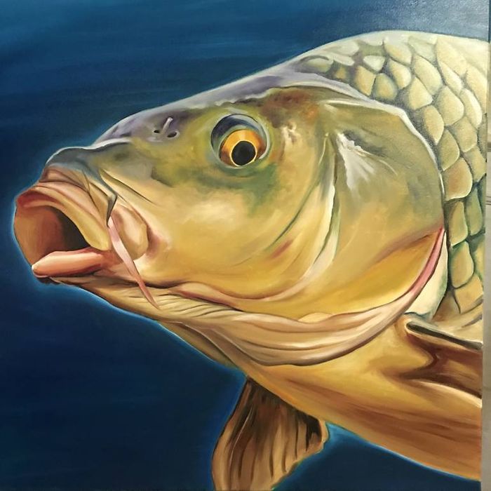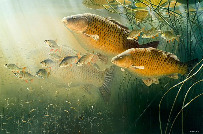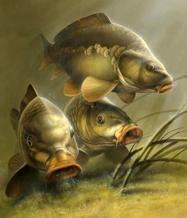 Tranh vẽ cá chép săn mồi, khắc họa sinh động khoảnh khắc mạnh mẽ và tinh tế của loài cá trong tự nhiên.