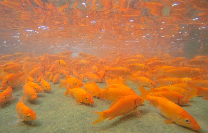 Hình ảnh cá vàng tung tăng bơi lội, mang đến cảm giác thanh bình và niềm vui nhẹ nhàng.