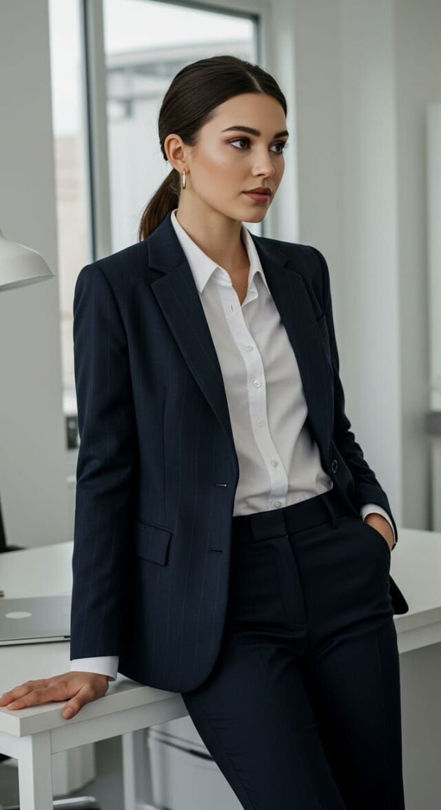 Phong cách châu Âu hiện đại thường chú trọng sự tối giản, đường nét sắc sảo và phom dáng chuẩn. Những bức ảnh doanh nhân nữ mặc vest kiểu Âu (double-breasted, suit oversize, vest kết hợp quần ống rộng…) tạo hiệu ứng hình ảnh sang trọng, thời thượng phù hợp với các chiến dịch branding cá nhân, làm hình ảnh PR doanh nghiệp hoặc truyền thông ngành sáng tạo.