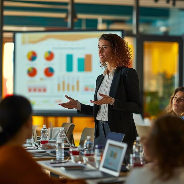 Loại ảnh này thể hiện vai trò lãnh đạo và sự chủ động trong công việc. Hình ảnh nữ doanh nhân trong buổi thuyết trình, cuộc họp hoặc training đội nhóm thường được sử dụng trong các tài liệu giáo dục, bài học kỹ năng hoặc chiến dịch lan tỏa hình mẫu phụ nữ bản lĩnh.