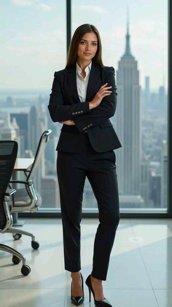 Hình ảnh nữ doanh nhân mặc vest và sơ mi trong môi trường công sở