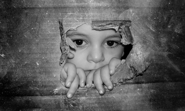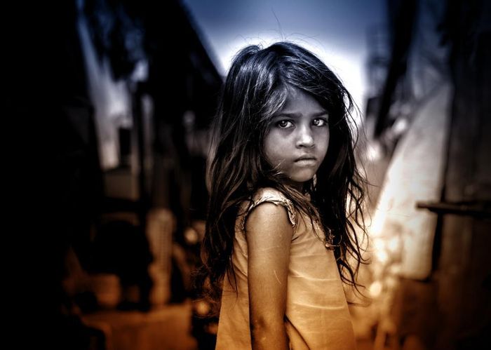 Đôi mắt buồn của em bé, phản chiếu sự ngây thơ và nỗi niềm khó tả