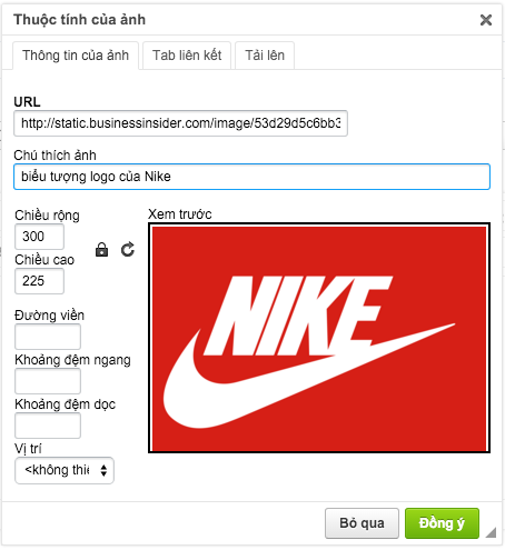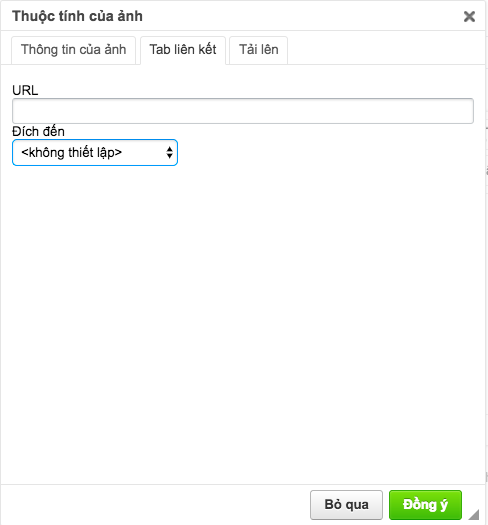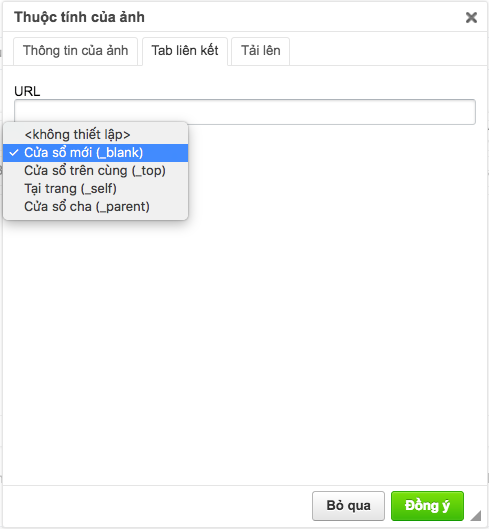 Khi nhấp vào hình ảnh , bạn sẽ được dẫn đến trang website nguồn của hình ảnh đó. Cách thực hiện như chèn hình ảnh, dán địa chỉ URL của hình ảnh đó vào mục Thông tin ảnh. Sau đó, chọn nút Tab liên kết > Ô URL – dán địa chỉ URL của website nguồn của hình ảnh đó> Ô Đích đến – chọn Cửa sổ mới.