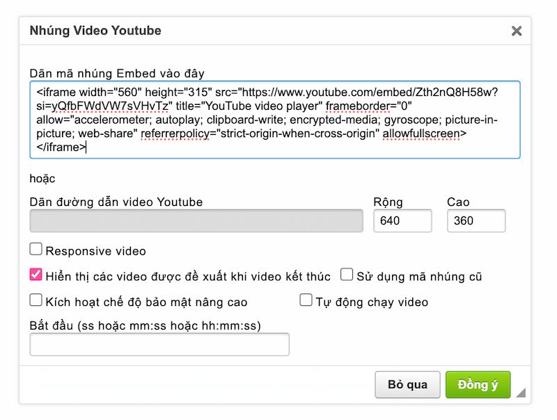 Sau đó, bạn chỉ cần dán vào ô “Paste Youtube Video URL (Dán đường dẫn video Youtube)” điền kích thước và KHÔNG chọn các ô check-box bên dưới, thế là xong.