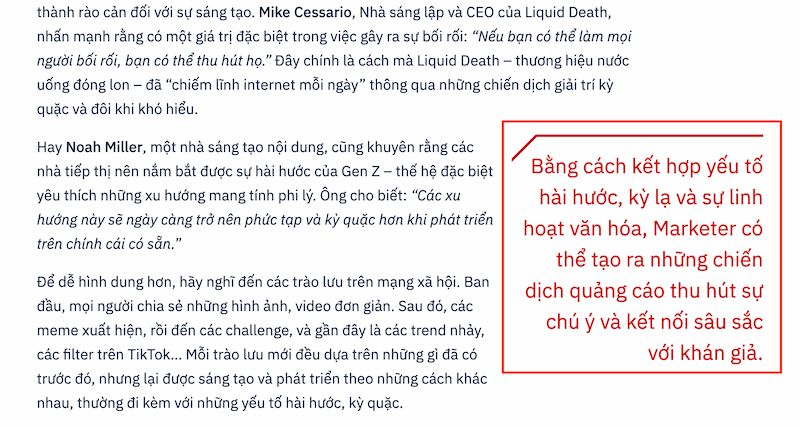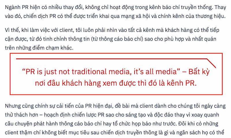 Trích dẫn nổi bật là một nét rất riêng của Brands Vietnam, không những giúp cho độc giả dễ dàng theo dõi những nội dung “tâm đắc”, “hay ho” nhất của bài viết, nó còn tạo ra những “khoảng nghỉ” cho mắt trong quá trình đọc bài, giúp cho việc đọc (bài dài) dễ chịu và thoải mái hơn.