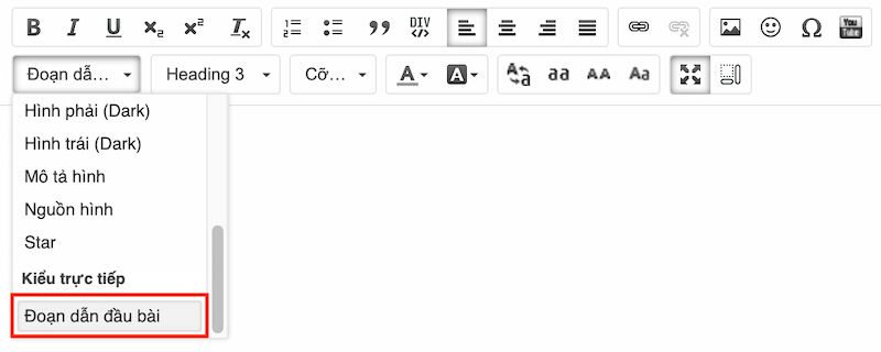 Bôi đoạn nội dung bạn muốn làm đoạn dẫn đầu và chọn kiểu ‘Đoạn dẫn đầu bài’ như hình dưới.