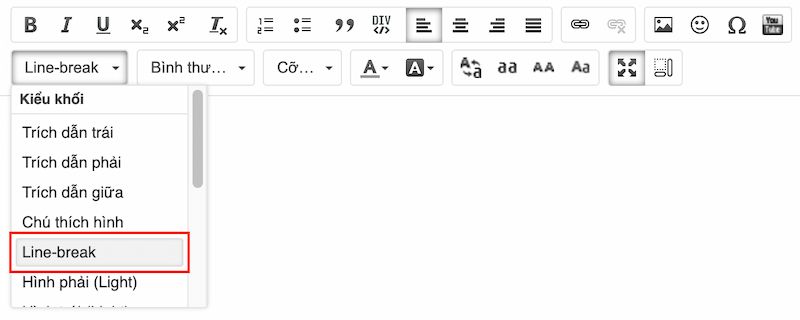 - Cách 1: Sử dụng kiểu “Line – Break”, giữa 2 đoạn văn sẽ có 1 đường nét gạch đứt phân cách. Để con trỏ chuột tại vị trí muốn tạo phân cách giữa 2 đoạn. Sau đó chọn kiểu “Line – Break” trên thanh công cụ.
