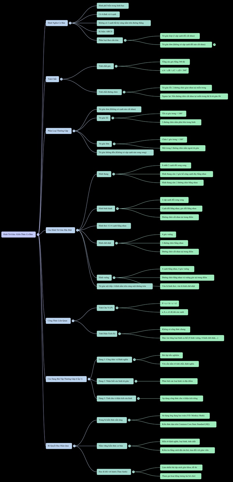 Tứ giác là hình có 4 cạnh và 4 góc, gồm nhiều loại phổ biến như hình vuông, hình chữ nhật, hình thoi, hình bình hành, hình thang… Việc nắm vững công thức chu vi và diện tích của từng loại sẽ giúp giải quyết nhanh các bài toán hình học.