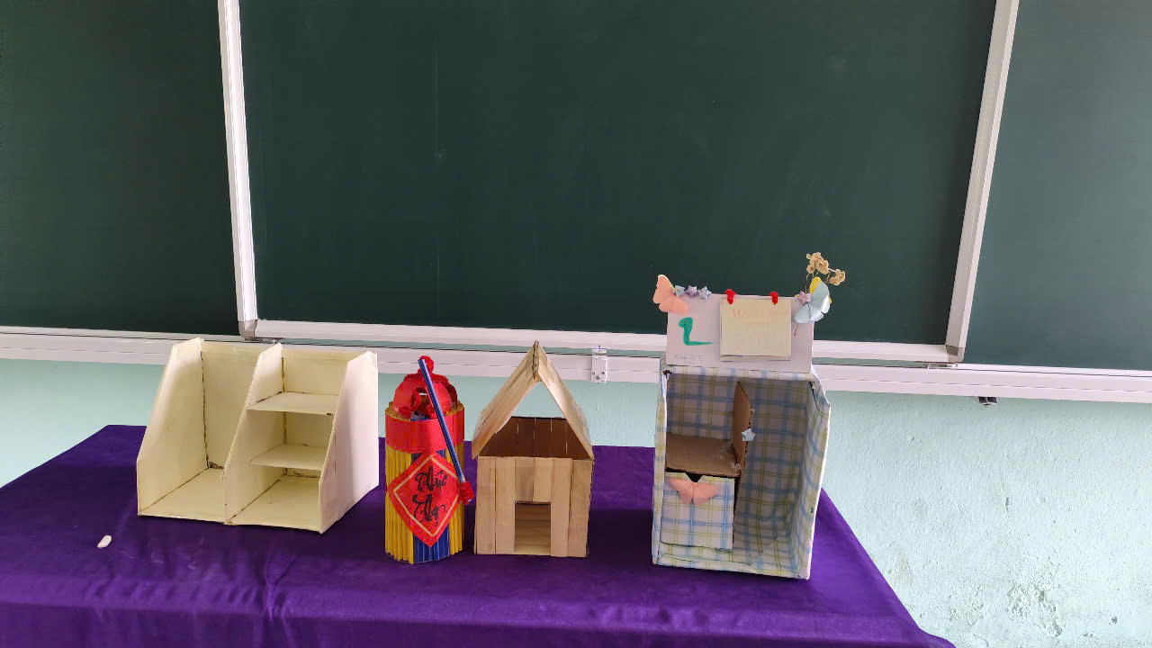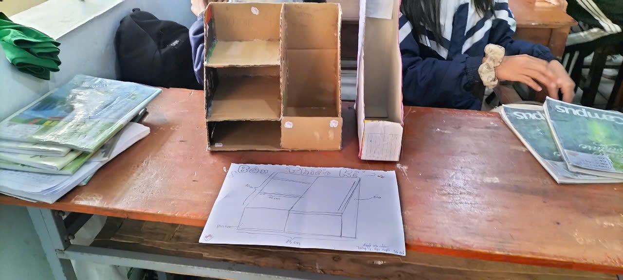Sản phẩm đồ vật có dạng hình lăng trụ đứng đã chế tạo và nội dung trình bày báo cáo của các nhóm.