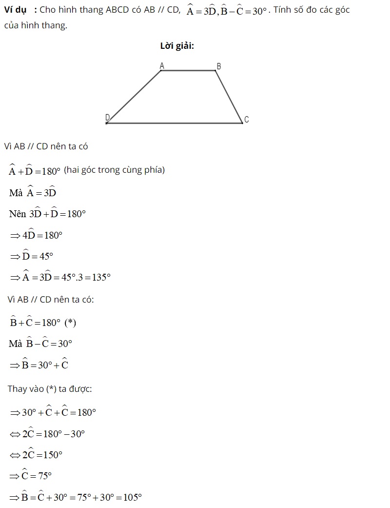 Phương pháp giải: Chúng ta sẽ dựa vào tính chất về tổng bống góc trong một tứ giác và hai đường thẳng song song kết hợp cùng kiến thức đã học về hình thang vuông để tính số đo góc chính xác.