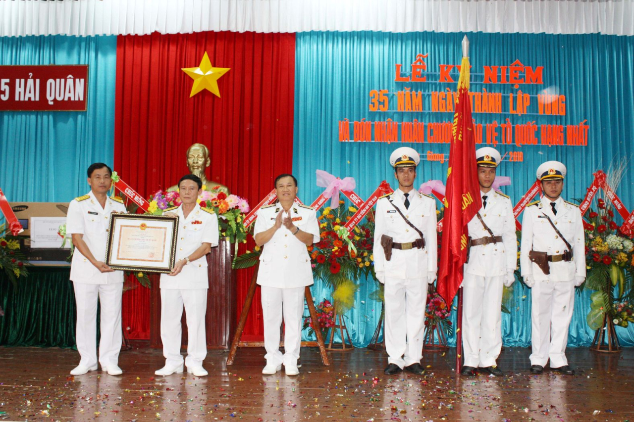 Phó Đô đốc Trần Thanh Huyền, nguyên Bí thư Đảng ủy, nguyên Chính ủy Hải quân trao Huân chương bảo vệ Tổ quốc hạng Nhất tặng Vùng 5 nhân dịp kỷ niệm 35 năm Ngày thành lập. Ảnh: CTV