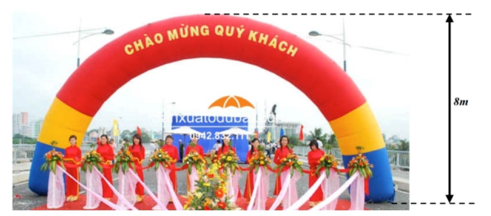 Ví dụ 3: Trong lễ bàn giao công trình của một công ty xây dựng cầu đường, công ty thiết kế một cổng chào bằng phao chứa không khí ở bên trong, có hình dạng giống như một nửa cái săm ô tô khi bơm căng. Cổng chào có chiều cao so với mặt đường là $8m$ (tham khảo hình vẽ), phần chân của cổng chào tiếp xúc với mặt đường theo một hình tròn có đường kính là $2m.$ Nếu bỏ qua độ dày của lớp vỏ cổng chào, mặt đường coi là bằng phẳng thì thể tích không khí chứa bên trong cổng chào bằng