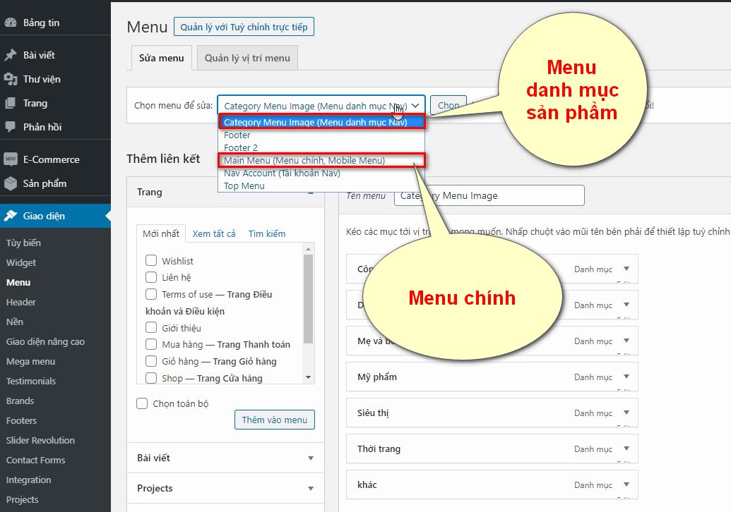 Bước 2: Chọn lựa menu muốn gắn icon. Bạn sẽ thấy phía trong tab Sửa menu sẽ có phần Chọn menu để sửa. Nếu bạn muốn gắn icon cho những trang trên menu chính thì bạn chọn loại là Main Menu (Menu Chính, Mobile Menu), còn muốn gắn icon cho menu danh mục sản phẩm thì bạn chọn loại là Category Menu Image (Menu danh mục Nav).