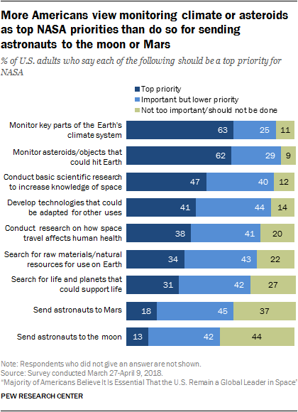 Majorities say monitoring climate or tracking asteroids should be a top NASA priority; only 13% say the same of putting astronauts on the moon