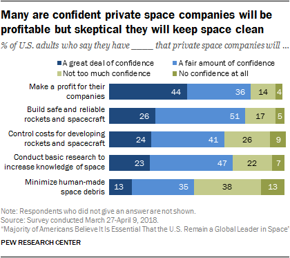 Most Americans express confidence that private space companies will be profitable, but are skeptical that those companies will minimize hazardous space debris