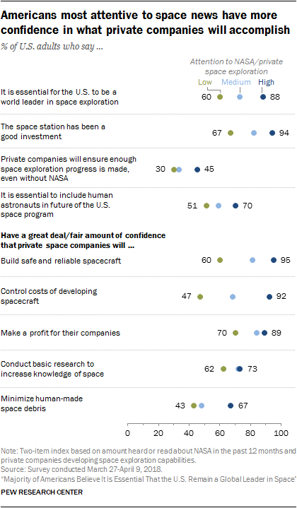 Those who have heard a lot about space news also tend to express more confidence in private space companies to handle key aspects of space exploration, especially building safe and cost-effective spacecraft. For example, 95% of Americans who are most attentive to news about NASA and private space companies have at least a fair amount of confidence that those companies will build safe and reliable rockets and spacecraft; 58% of this group has a great deal of confidence in companies to do this. By comparison, 60% of those who have heard nothing about NASA and private space companies have at least a fair amount of confidence in private companies to build safe and reliable spacecraft.
