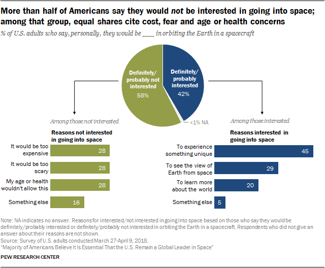 Among the 42% of Americans who would be interested in traveling into space, 45% of them say the main reason for their interest would be to “experience something unique.” Some 29% of this group say they would go so that they can see the view of Earth from space, while 20% want to “learn more about the world.”