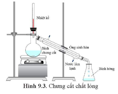 Chưng cất bao gồm hai giai đoạn: hay hơi và ngưng tụ. Hình 9.3 dưới đây sẽ mô tả bộ dụng cụ dùng để chưng cất chất lỏng trong phòng thí nghiệm.