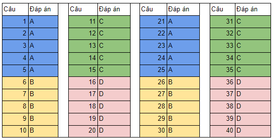 + Nhóm 8 (từ câu 36 đến câu 40) tô toàn bộ đáp án D.