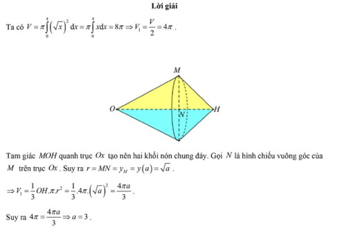 Gọi V1 là thể tích khối tròn xoay được tạo thành khi quay tam giác MOH quanh trục Ox. Biết rằng V=2V1. Tính a?