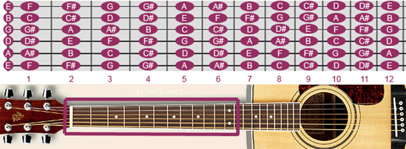 Nếu bạn nắm vững nhạc lý về cung và nữa cung thì bạn sẽ rất dễ dàng suy ra các nốt nhạc cơ bản trên đàn guitar. Mỗi ngăn trên guitar được hiểu là 1 cung. Từ điều này bạn dễ dàng suy ra các nốt còn lại khi biết vị trí các nốt nhạc đầu tiên.