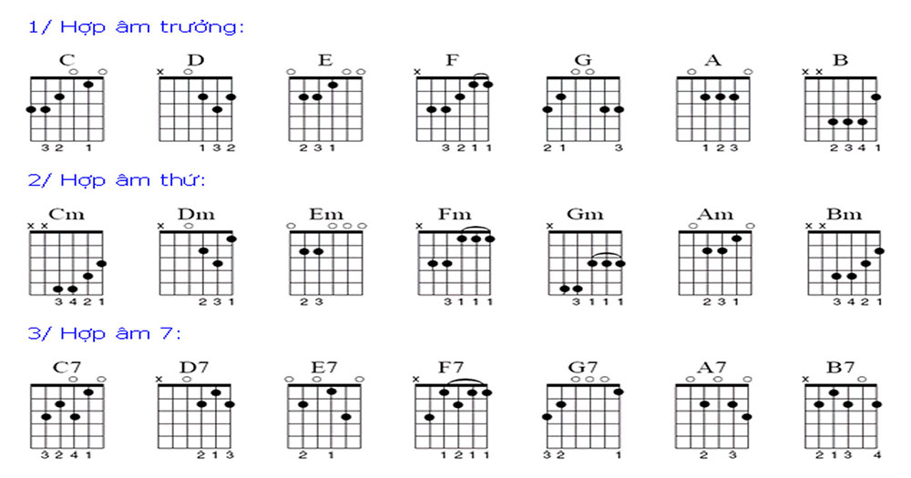 – Chữ cái thêm chữ “m” phía sau người ta gọi là hợp âm thứ. Cm= Do thứ, Dm= Re thứ, Em= Mi thứ,Fm= Fa thứ, Gm= Sol thứ, Am= La thứ, Bm= Si thứ.
