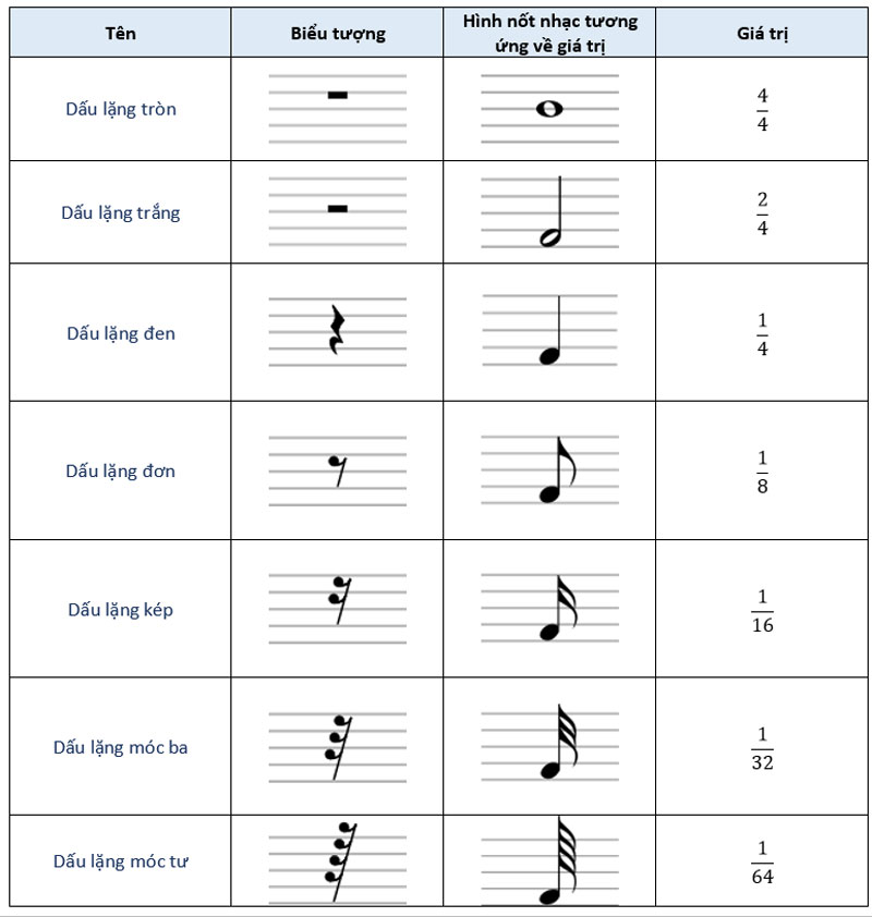 – Nốt lặng là nhưng nốt có giá trị thời gian như các nốt bình thường nhưng không phát ra âm.