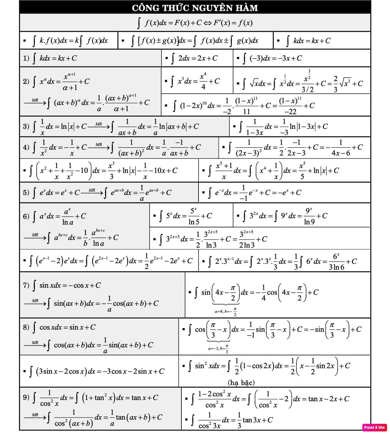 Tổng hợp bộ công thức nguyên hàm chương trình học toán 12 học sinh cần phải nhớ.