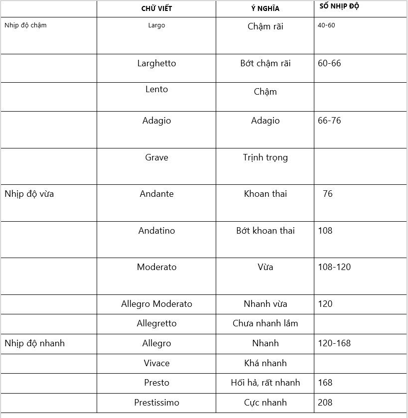 Nhịp độ thường được chia làm 3 nhóm chính: chậm, vừa, và nhanh. Dưới đây là bảng phân loại phổ biến, kèm số nhịp/phút (BPM):